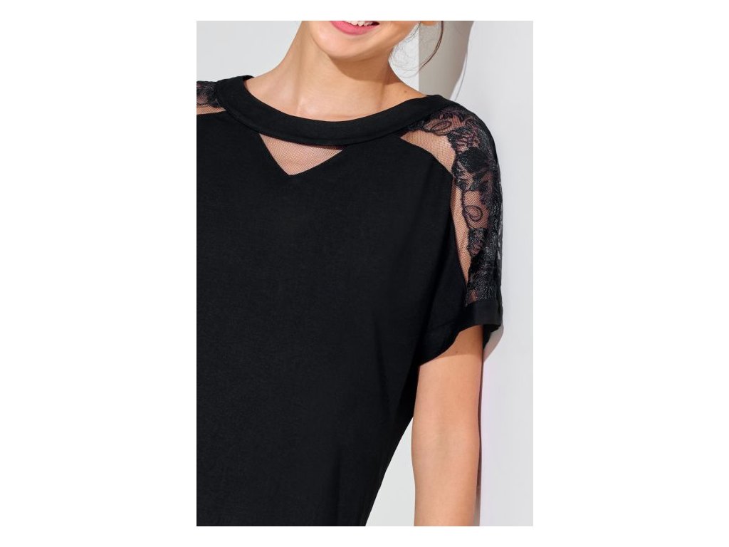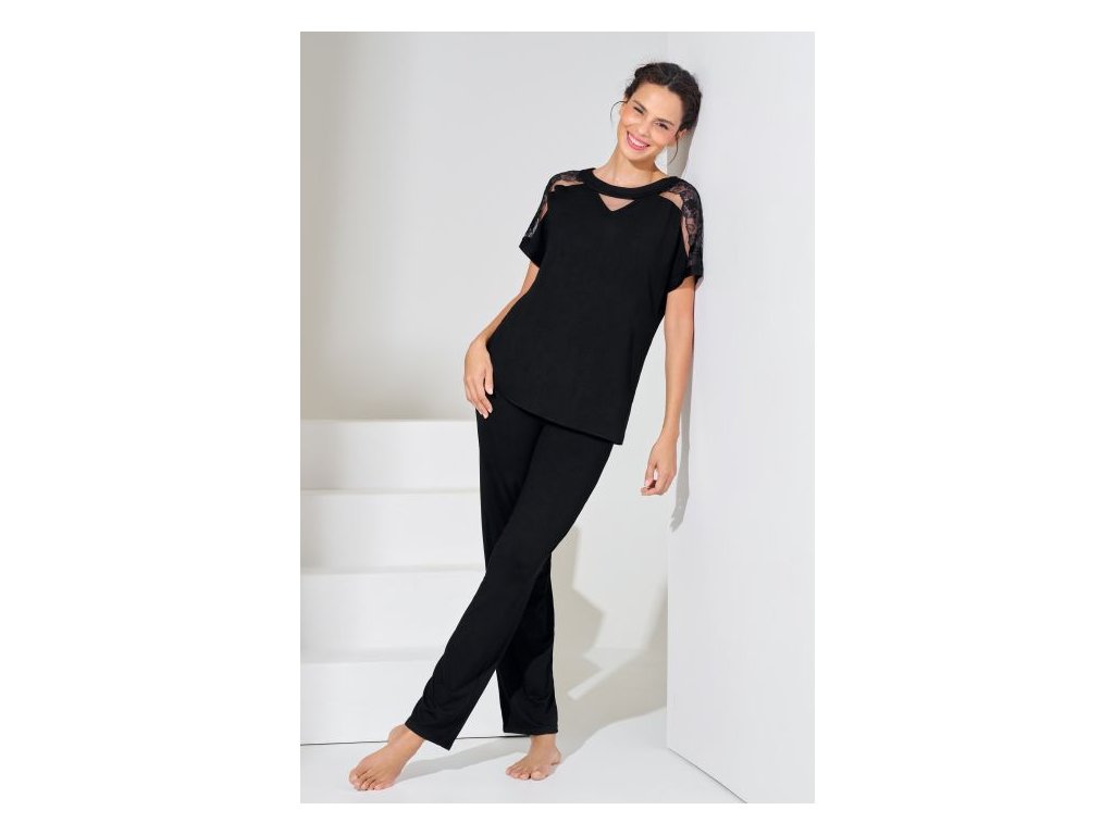 Pyžamo Eminence je z luxusní řady nočního prádla, vyrobené ze splývavé viskózy. Střih horního dílu má kratší netopýří rukávy, na rukávech je krajková vsadka pro větší rafinovanost. Výstřih zdobí tylový trojúhelík. Střih kalhot je rovný, v pase na gumu. Velmi elegantní a sofistikovaný kousek, který by neměl chybět v žádném ženském šatníku.