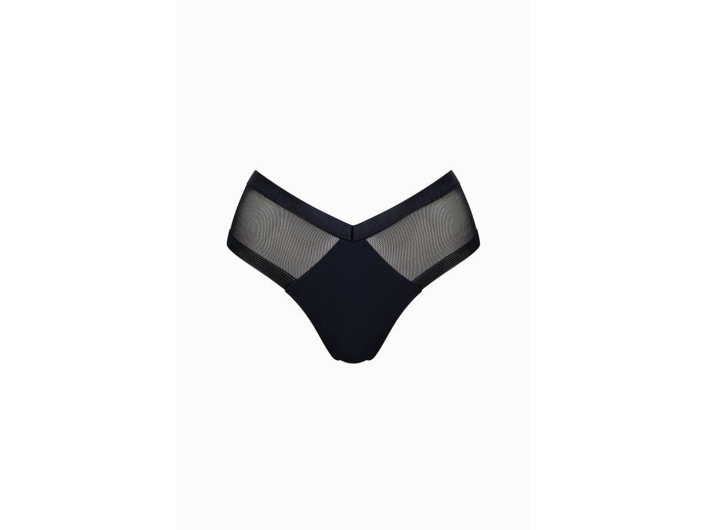 Kalhotky ve střihu brasil s vysokým výkrojem nohaviček. Kalhotky jsou ušity z dekorativního průhledného tylu s proužkovanou bordurou. Jemná gumička v pase a bavlněná vsadka v rozkroku. Velmí elegantní a nadčasový kousek.