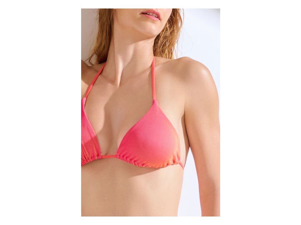 Minimalistická zavazovací bikinová podprsenka je ideální na opalování. Je vyrobena ze strukturovaného materiálu, který dokonale kopíruje křivky těla. Přední díl je podšitý jemnou podšívkou. Jedinečná je svou barevností, kdy oranžová barva vytváří dojem jemně se měnících barev.