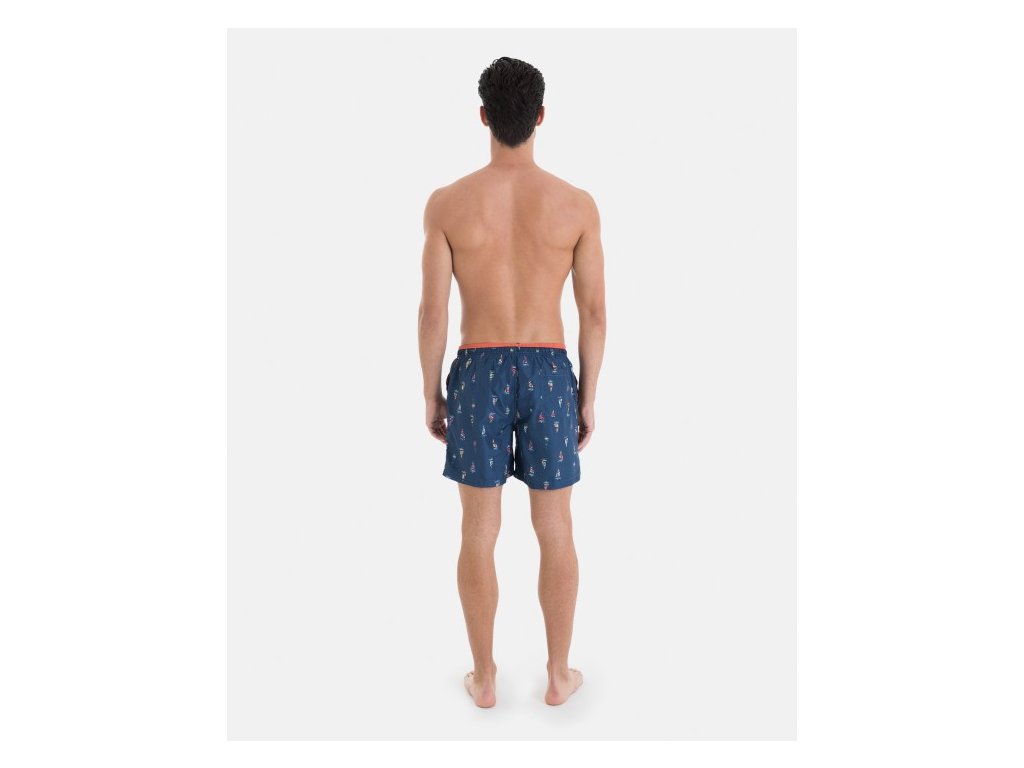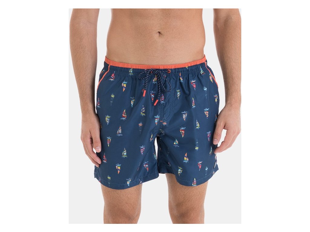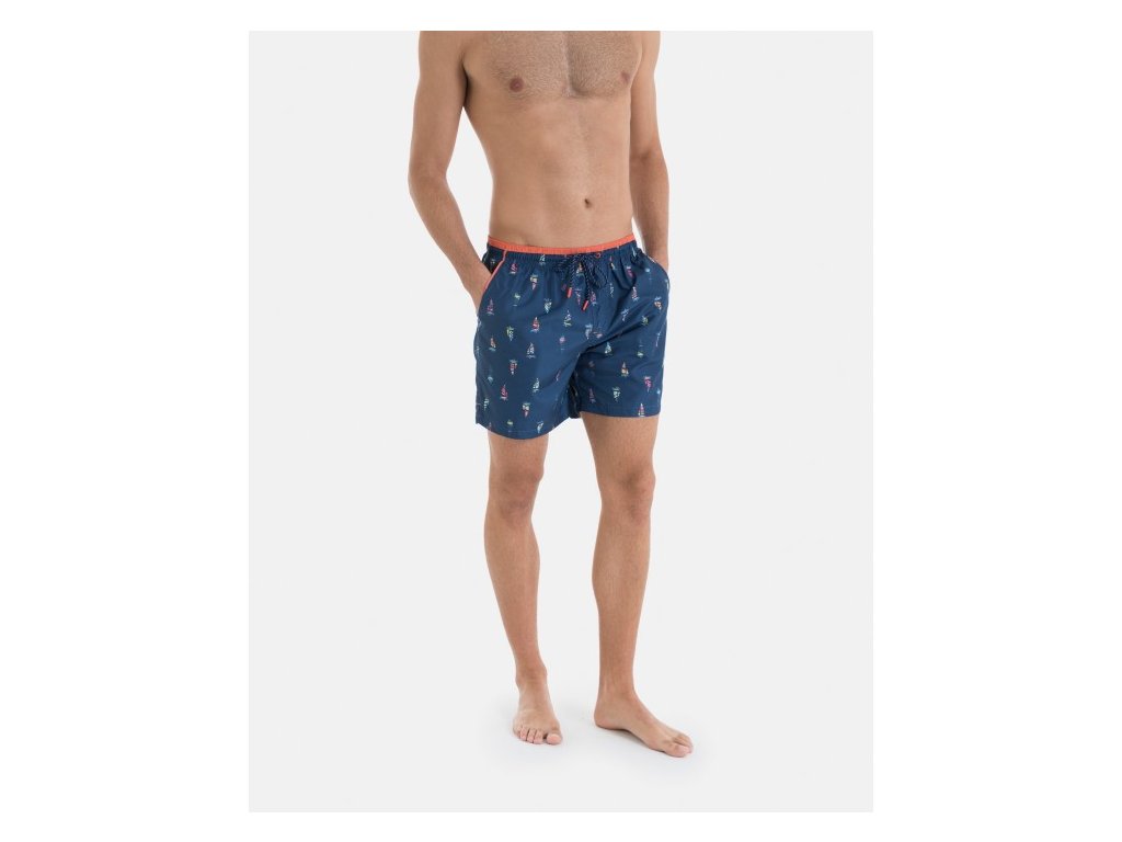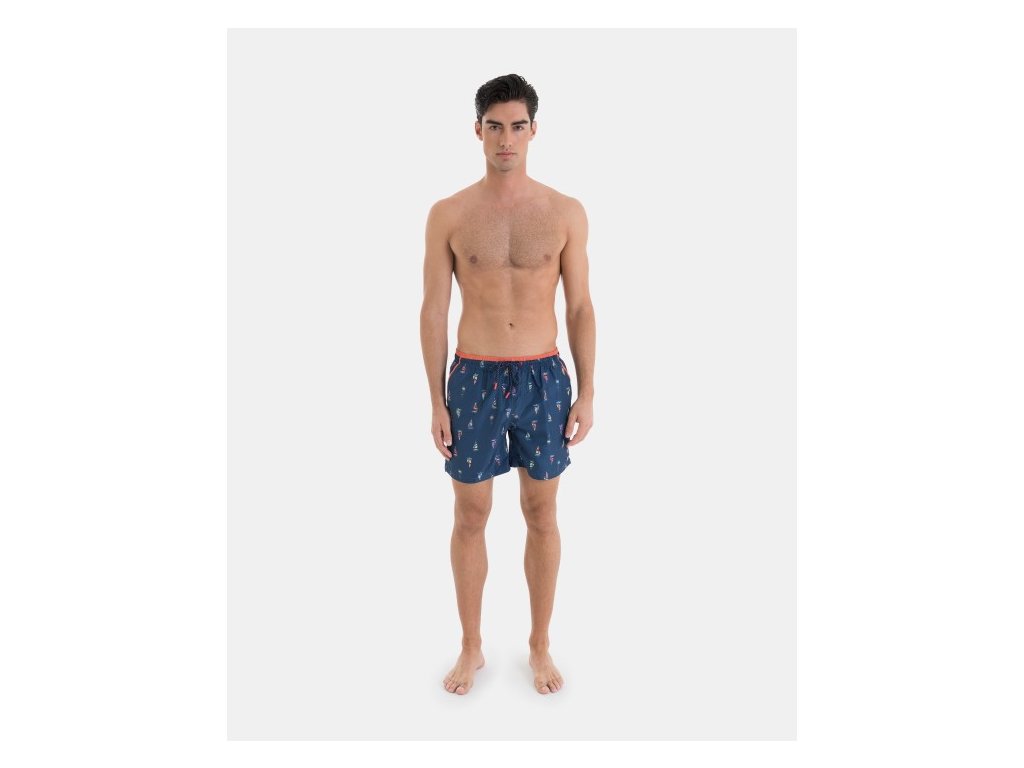 Tyto pánské plavkové šortky v námořnické modři s námořnickým vzorem je ideální na léto. Její design zahrnuje pružný pas se stahovací šňůrkou a boční kapsy pro větší pohodlí. Vyrobeno z lehké, rychleschnoucí tkaniny, ideální na pláž nebo k bazénu.