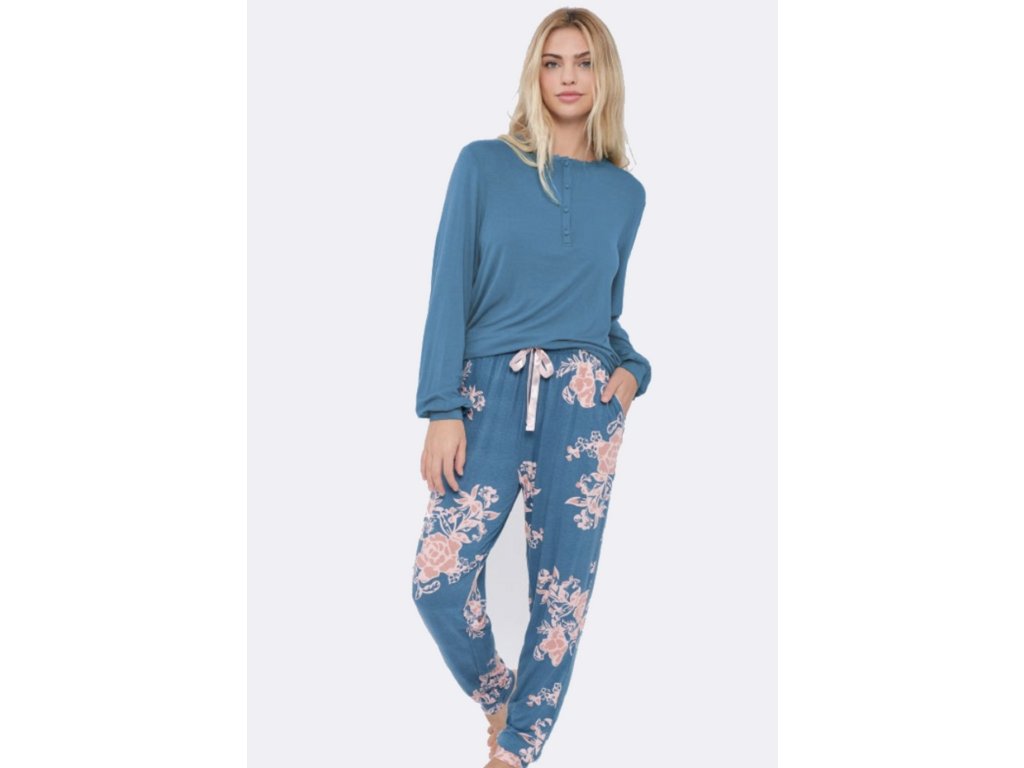 Dámské pyžamo ušité je ušito z krásného splývavého materiálu, který je velmi příjemný a lehce chladivý. Viskoza je přirodní materiál, který se výborně nosí. Tričko má ve výstřihu knoflíčky obšité látkou a zdobený dekolt kraječkou. Nohavice i rukávy jsou zpracované do manžetky.