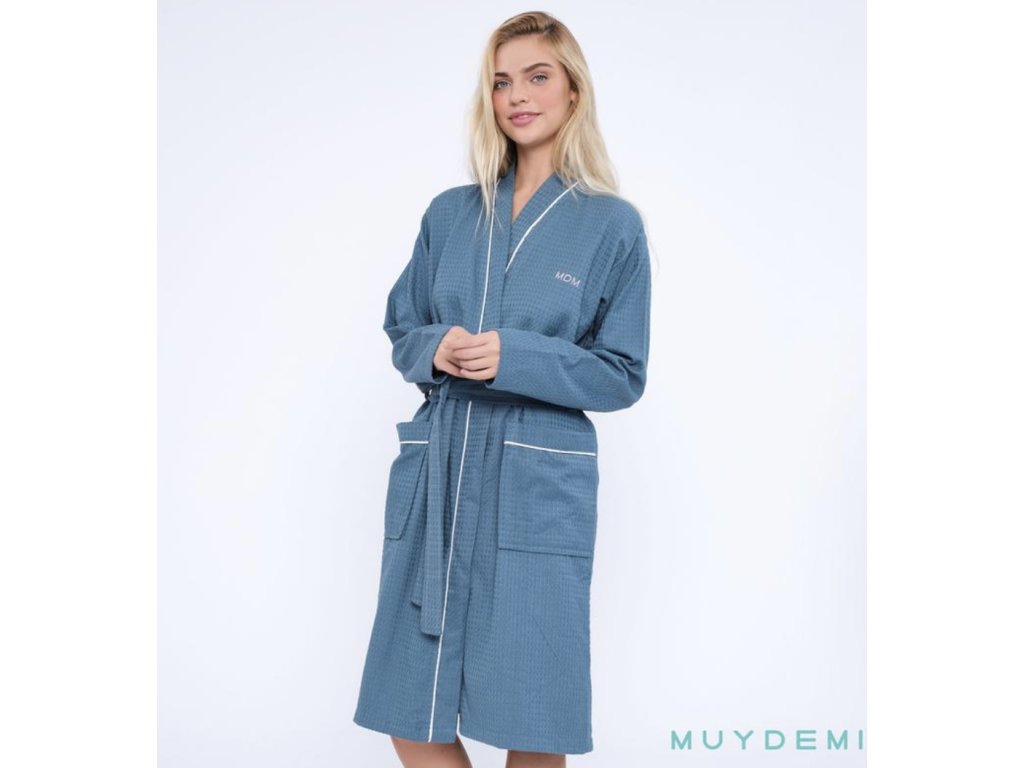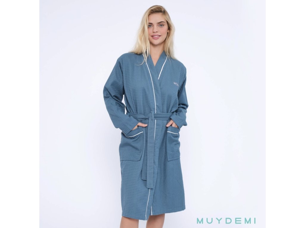 Vaflový dámský župan vyroben ze 100% bavlny je ideální po koupeli nebo do sauny. Příjemný kimonový střih, širší rukávy a prostorné kapsy. V pase pásek na zavazování.