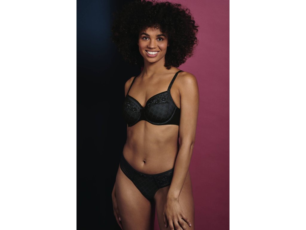 Dámská podprsenka Rosemary v černé barvě v kombinaci se světle modrou podšívkou je kvalitní podprsenka, která skvěle padne. Košíčky mají vyšší střed a v dekoltu je vyšší, aby perfektně podržela a vytvarovala poprsí. Po stranách skvěle drží a formuje tak prsa směrem dopředu. Vytváří tak krásný a pevný dekolt a brání nepříjemnému "vypadávání" prsou v dekoltu. Má moc hezký design jemné hladké krajky v kombinace s jemnými čtverečky, která se ale nerýsuje pod oblečením.