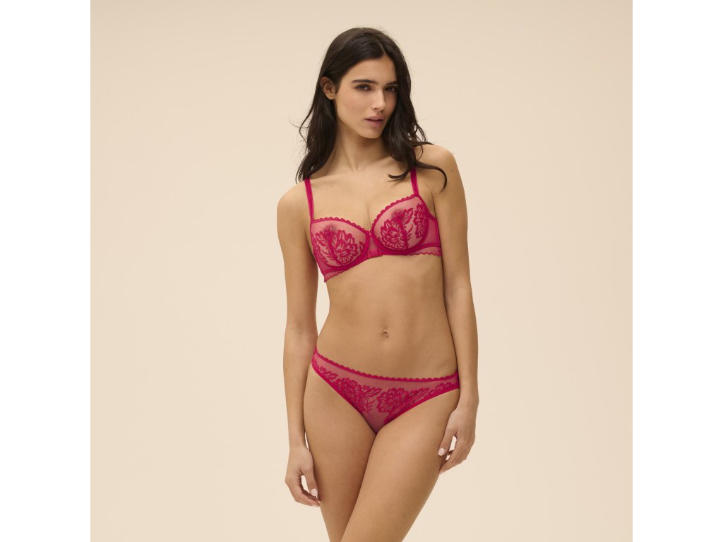 Kalhotky v klasickém střihu s luxusní francouzskou krajkou. Přední část zdobí květinová krajka s vroubkovanými okraji. Vzadu jsou kalhotky z jemného mikrovlákna s laserově řezanými okraji. Jsou neviditelné pod oblečením. Klínek ze 100% bavlny.